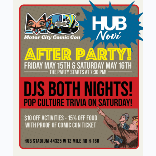 Want to keep the party going with family, friends, and fellow con-goers? Check out the HUB Stadium – Novi for live music, Axe Throwing, Ice Curling, and Football Bowling and MC3 inspired food and drink! On Saturday, May 16th, join the HUB for some MC3 inspired TRIVIA! Each guest will receive 15% off of their food purchase plus a $10 discount off any active entertainment! Proof of MC3 admission will be required to access these savings.
